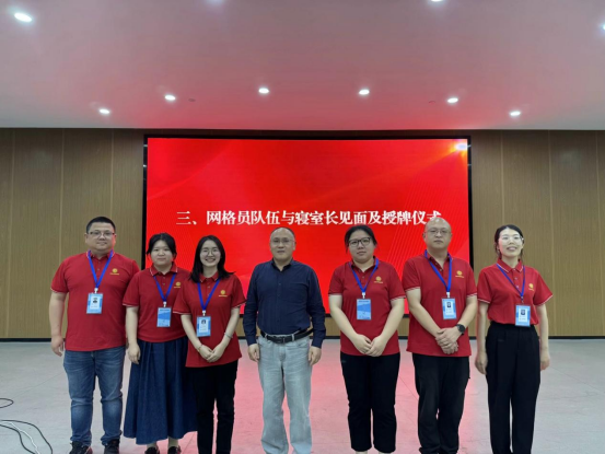 会议第三项,网格员队伍与寝室长见面及授牌仪式,各网格员上台进行自我介绍并被授予工牌。