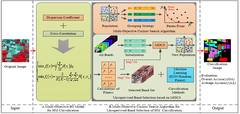 高光谱遥感图像凭借丰富的信息量能够清晰地区分地物之间的细微差别,被广泛应用到生态系统监测、农业发展和城市规划等领域。其中,高光谱图像波段选择是高光谱图像处理的基础问题之一,而波段选择是一个组合优化问题,智能优化算法在解决组合优化问题中起着至关重要的作用。当前研究多数只使用单一目标作为选择指标,忽略了高光谱图像的整体特征,这会导致目标分类的不准确。该研究设计了一种基于多目标布谷鸟搜索算法的波段选择方法,构建了基于波段信息量和相关性的多目标无监督波段选择模型来降低数据冗余度并提升分类精度。论文针对多目标布谷鸟搜索算法迭代后期易陷于局部最优设计了一种基于种群拥挤度的自适应策略;同时,为了平衡全局探索和局部开发阶段的搜索能力,提出了一种基于分组和交叉的信息共享策略以克服个体信息交互缺乏问题。