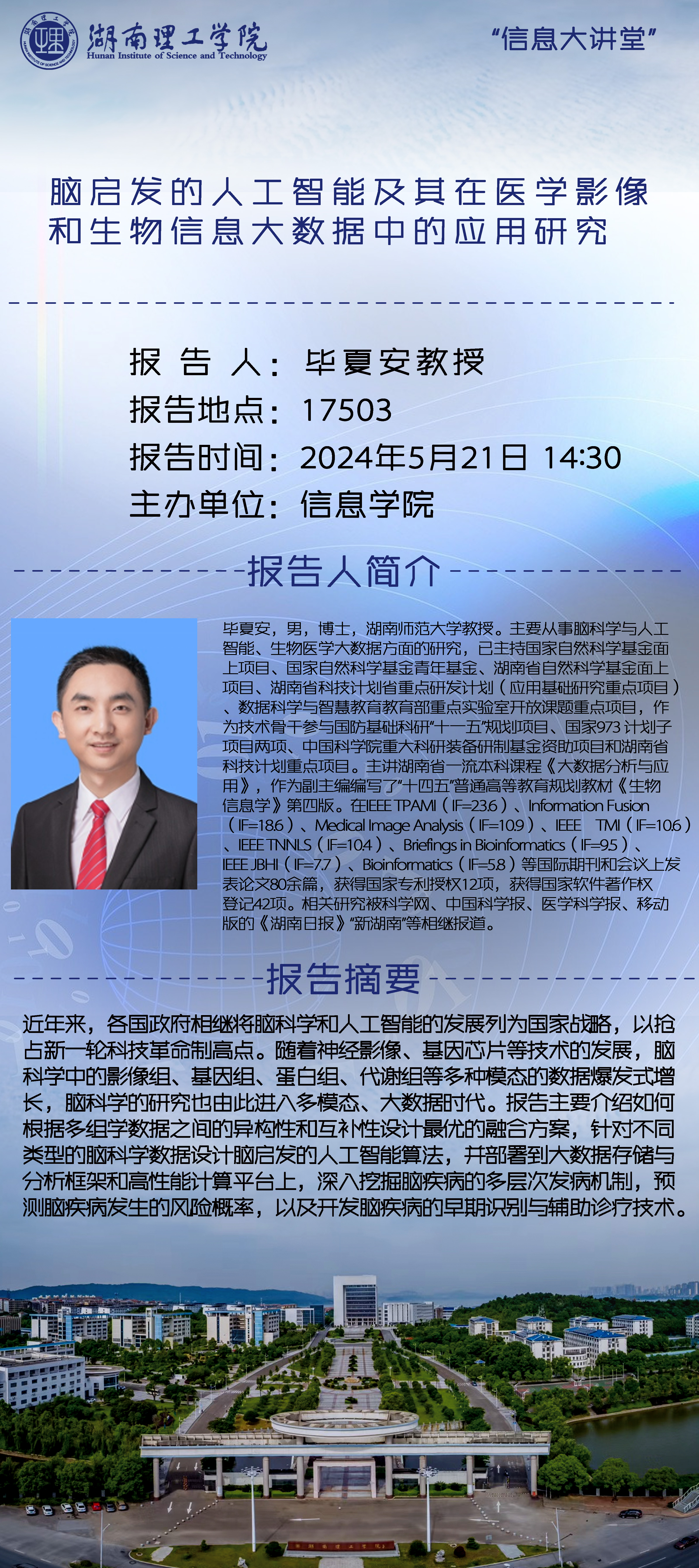 毕夏安,男,博士,湖南师范大学教授。主要从事脑科学与人工智能、生物医学大数据方面的研究,已主持国家自然科学基金面上项目、国家自然科学基金青年基金、湖南省自然科学基金面上项目、湖南省科技计划省重点研发计划(应用基础研究重点项目)、数据科学与智慧教育教育部重点实验室开放课题重点项目,作为技术骨干参与国防基础科研“十一五”规划项目、国家973 计划子项目两项、中国科公司重大科研装备研制基金资助项目和湖南省科技计划重点项目。主讲湖南省一流本科课程《大数据分析与应用》,作为副主编编写了“十四五”普通高等教育规划教材《生物信息学》第四版。在IEEE TPAMI(IF=23.6)、Information Fusion(IF=18.6)、Medical Image Analysis(IF=10.9)、IEEE TMI(IF=10.6)、IEEE TNNLS(IF=10.4)、Briefings in Bioinformatics(IF=9.5)、IEEE JBHI(IF=7.7)、Bioinformatics(IF=5.8)等国际期刊和会议上发表论文80余篇,获得国家专利授权12项,获得国家软件著作权登记42项。相关研究被科学网、中国科学报、医学科学报、移动版的《湖南日报》“新湖南”等相继报道。
