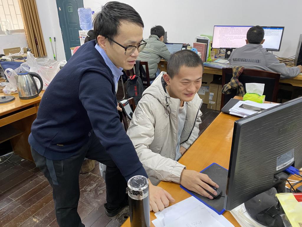 教师谢文武(左一)指导研究生场景