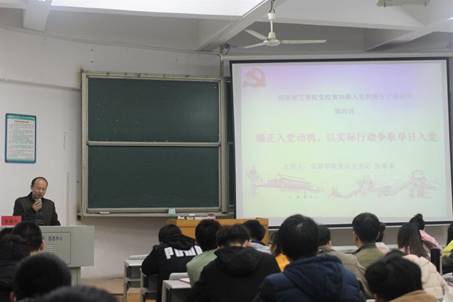 接着,他强调:正确的入党动机只有一个——为共产主义献身,全心全意为人民服务。针对如何正确树立入党动机他指出,端正入党动机是一辈子的事,同学们应首先从思想上积极向党组织靠拢,增强党的理论学习,增强党史和党章的学习,树立正确的人生目标,勇于实践。