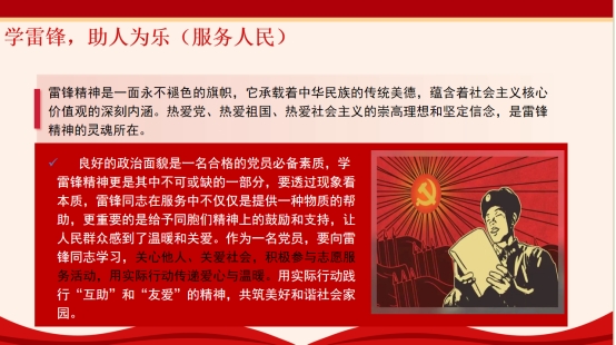 党员同学纷纷表示,要以雷锋同志为榜样,要将雷锋精神内化于心、外化于行,用实际行动践行党员的初心和使命。