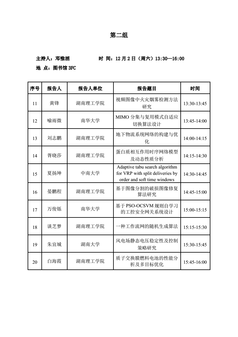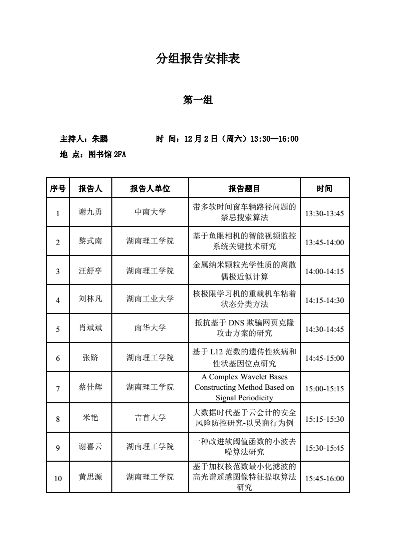 第十届湖南省研究生创新论坛先进计算和智能信息处理分论坛分组报告安排表