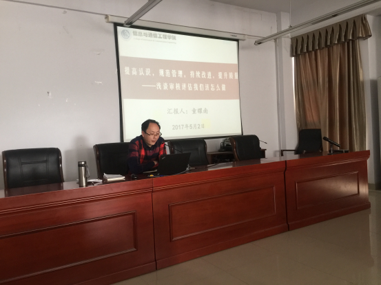 首先,常规本科教学分管负责人童耀南博士做了题为“提高认识,规范管理,持续改进,提升质量 ---- 浅谈审核评估我们该怎么做”的专题报告,他先从审核评估制度解释与概况、思想理念与要求、评估范围与特征、项目要素与说明等四个方面对本科教学工作审核评估方案进行了解读;接着就公司,教研室、实验室、教学办、行政办、学工办等二级机构,以及教师个人三个层面如何按照审核评估要求做好相关工作作了具体分析和安排;最后总结了公司本科教学和人才培养工作中还存在的主要问题,并提出了改进思路与措施。
