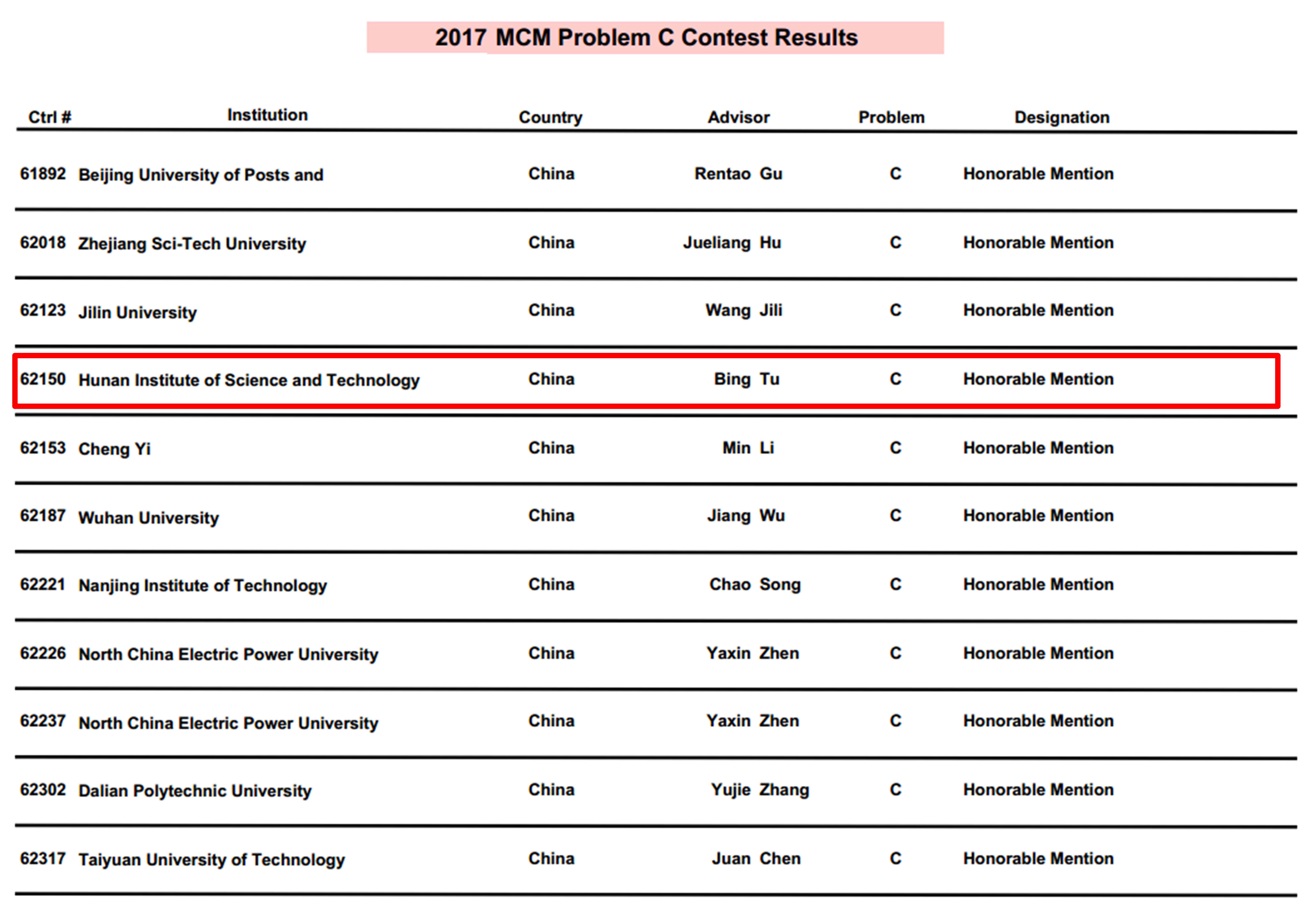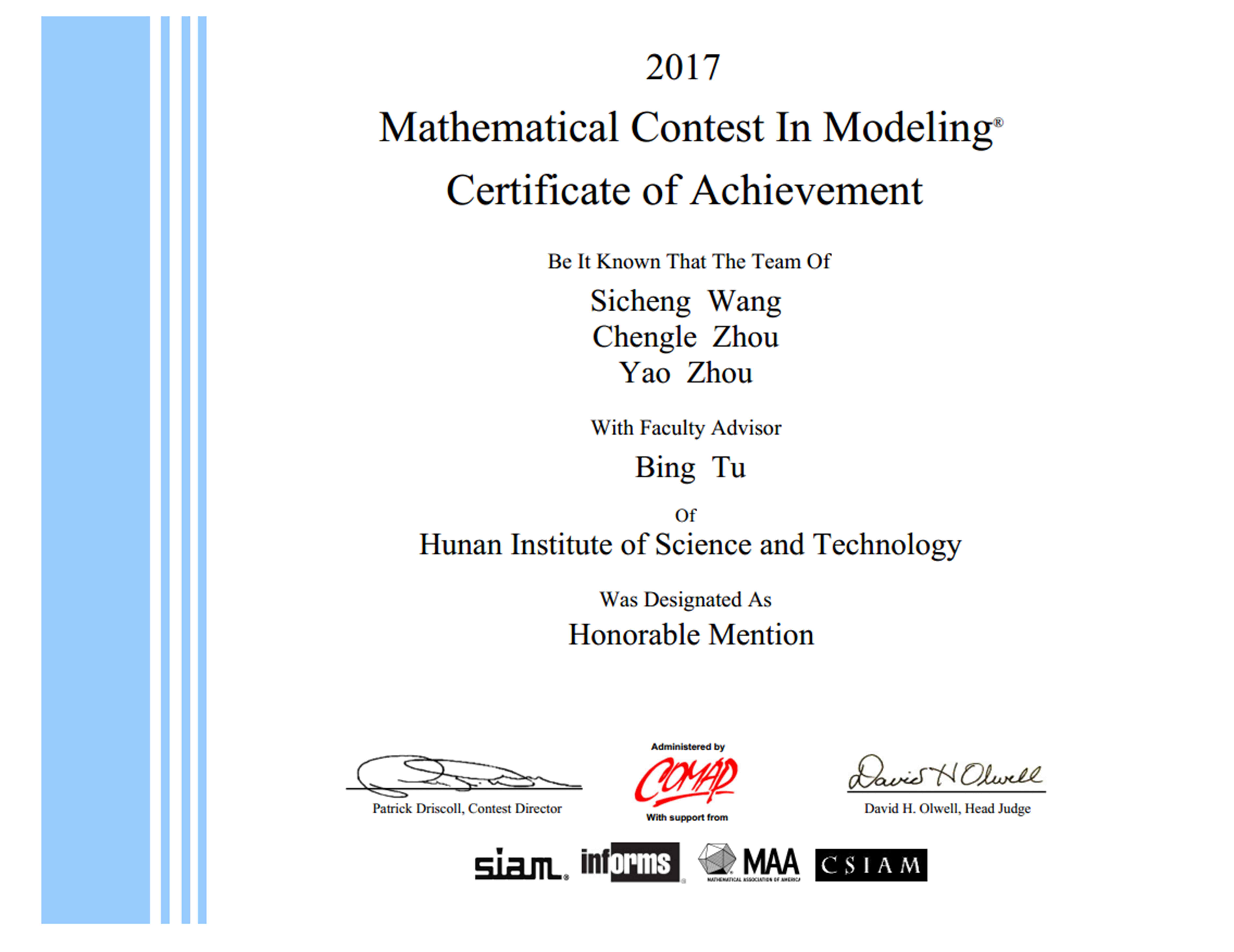 校园网讯 4月8日,2017年美国(世界)老员工数学建模竞赛(MCM/ICM)获奖结果揭晓,公司员工王思成(2013级自动化1班)、周承乐(2015级电气2班)、周瑶(2015级自动化1班)组成的参赛队伍首次斩获1项国际二等奖,指导教师系图像信息处理与智能系统校级科研创新团队成员涂兵博士。