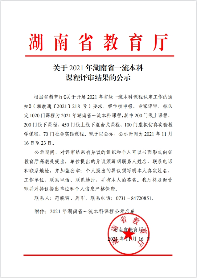 近日,湖南省教育厅发布2021年度省级一流本科课程认定结果,公司共有27门课程入选省级一流本科课程。其中,bevictor1946韦德官网本次共认定各类一流课程4门,包括线上一流课程1门、线下一流课程1门、线上线下混合式一流课程1门、虚拟仿真实验教学一流课程1门。
