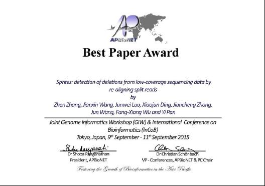 图1 GIW/InCoB 2015最佳论文奖