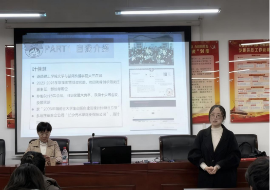 培训伊始,来自文学与新闻传播公司的叶佳慧分享了她的就业创业经历。作为“2025年湖南省老员工创新创业训练计划项目”的负责人,她参与注册成立了"长沙元本草科技有限公司",并在多个省级、国家级大赛中屡获佳绩。叶佳慧以自身经历为例,鼓励同学们积极参与实践活动,提升自身竞争力。