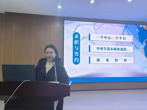 徐壮分别从三个方面对求职与签约进行讲解。首先,介绍了毕业生就业指导中心、云就业平台和招就处以及档案馆的老师,明晰其工作内容和职责。徐壮强调毕业生需积极利用中心和平台落实就业相关的手续,其次,徐壮详细讲解了毕业生基本就业流程。包括毕业生就业推荐书的作用、就业协议书的签订流程、快捷方便的网上签约平台,也介绍了校园招聘和社会招聘的区别,呼吁同学们积极参加校园招聘活动,在实践中增长自身就业本领。最后,徐壮向大家分析了当前的就业形势,并通过展示2022届毕业生优秀的就业数据结果,希望大家能够对自己充满信心,积极看待就业形势,同时提出基层就业也是不错的选择,鼓励大家事先做好求职准备。