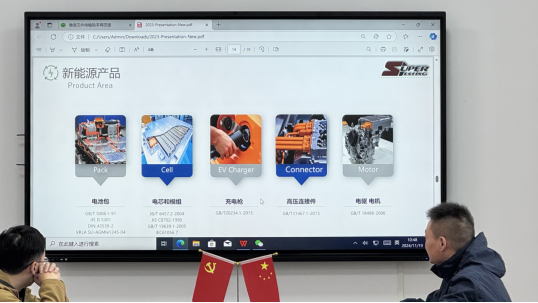 接着,李华通过PPT详细介绍了企业情况,苏勃检测是一家针对汽车及零部件、新能源、轨道交通等高端制造业领域的测试服务、技术服务为一体的质量机构,在认证认可、质量保证、新能源领域测试、电池测试、材料及性能等方面均取得不错的成绩。