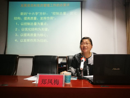 她以新“十六字”方针引入内容,详细讲解了《发展党员工作细则》的新要求及申请入党的基本条件,强调党员发展应严格履行入党程序手续,并举例说明了世情、国情、党情发生的深刻变化及党员发展环节存在的一些亟待解决的问题。