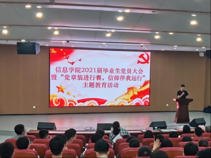全体毕业生党员在激昂的国歌歌声中肃立合唱国歌,接下来由周煊阳带领大家重温入党誓词。优秀毕业生党员代表王逸飞发言时说:“一名党员就是一面旗帜,要勇于发挥党员的先锋模范作用,积极带动身边的人一起为祖国的未来而奋斗。”